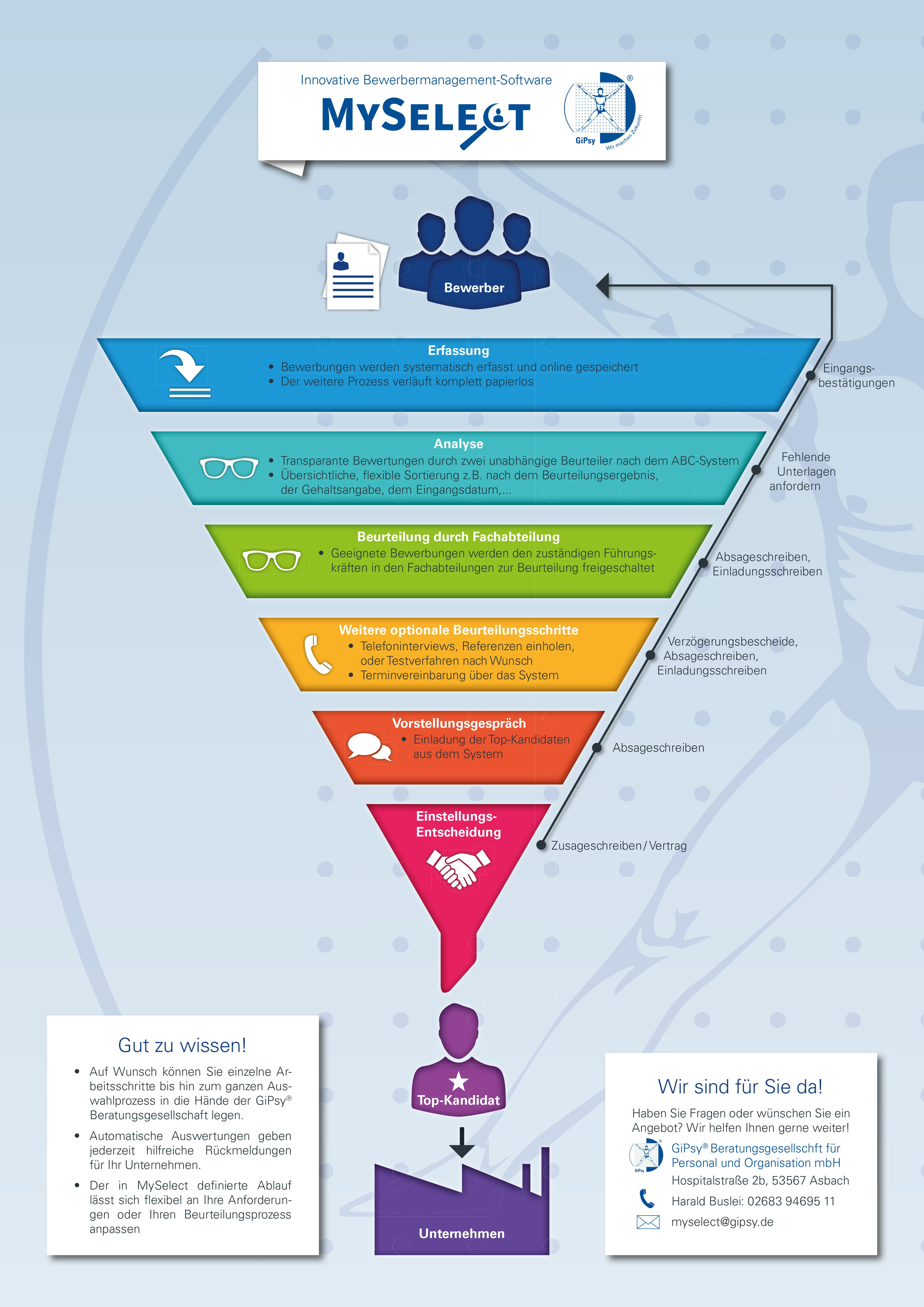 Im gesamten Bewerbungsprozess können unsere Kunden nach Wunsch einzelne Workflow-Schritte in die Hände der GiPsy® Beratungsgesellschaft geben oder selbst übernehmen.