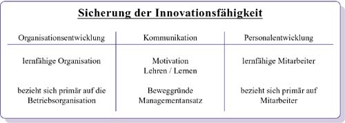 Die Personalentwicklung gelangt immer näher an die unternehmensprägenden Entscheidungen heran. So haben Trainings- und Coachingveranstaltungen immer häufiger nicht nur einen Personalentwicklungsansatz, sondern greifen immer häufiger in Organisationsabwicklungsmaßnahmen ein. Doch auf dem Weg dorthin bleiben einige in einer Sackgasse stecken. Eine Schrittmacherrolle einzunehmen, bedeutet die Innovationsfähigkeit des Unternehmens durch Personal- und Bildungsmaßnahmen zu erhöhen. Das kann gelingen, wenn ein Zusammenhang zwischen den „lernfähigen Mitarbeitern“ und der „lernfähigen Organisation“ hergestellt wird. Kommunikative Systeme schaffen die Voraussetzung für Innovation und Erfolg. Der Zusammenhang kann wie folgt skizziert werden: